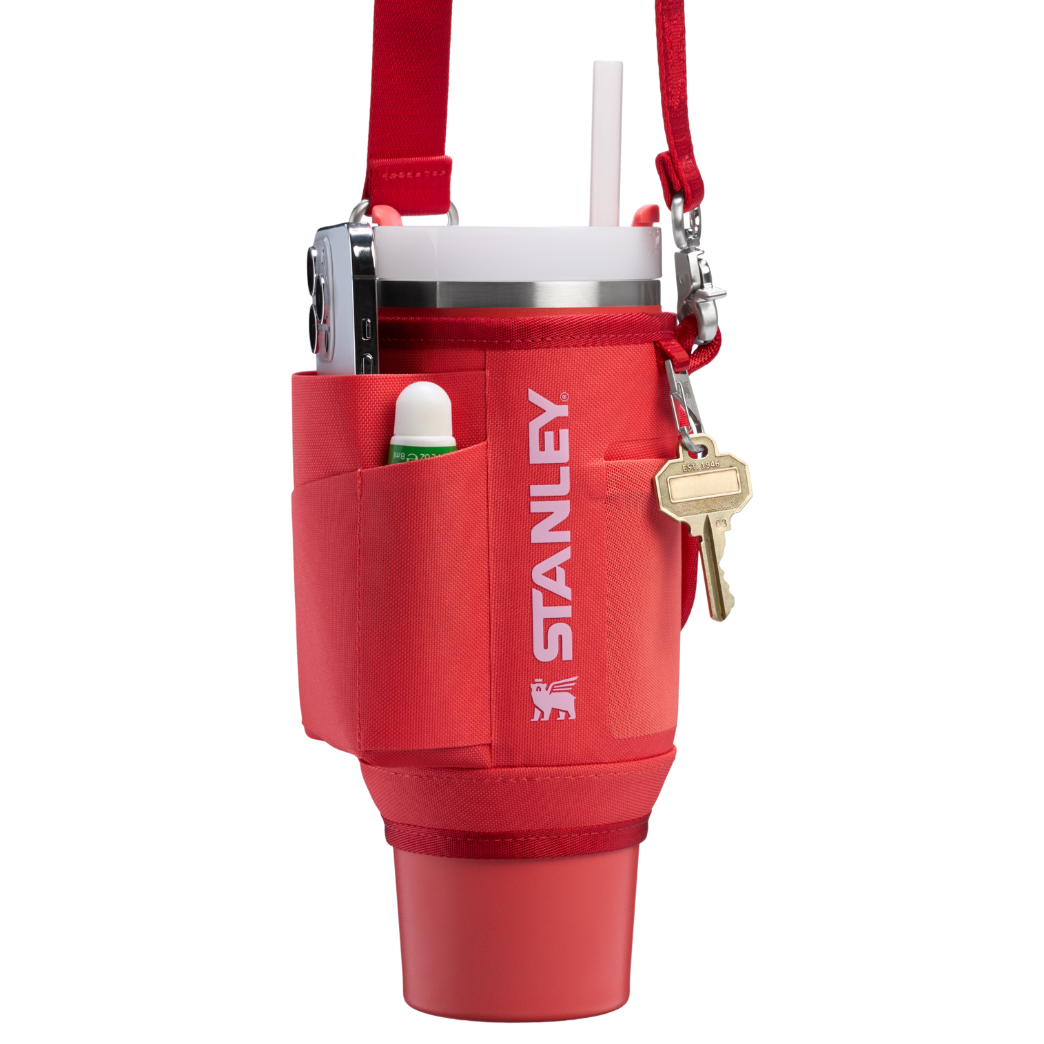 With three pockets, one is spacious enough to hold your phone while the second pocket below stores a slim wallet or card sleeve. A smaller mesh pocket holds compact headphones, lip balm, or the small extras you can't live without. Thoughtful design means a dedicated sleeve to hold onto your sunglasses, and a clip for your keys. Wherever the good times take you, move freely and stay hydrated with Stanley 1913's water bottle holder with a strap.